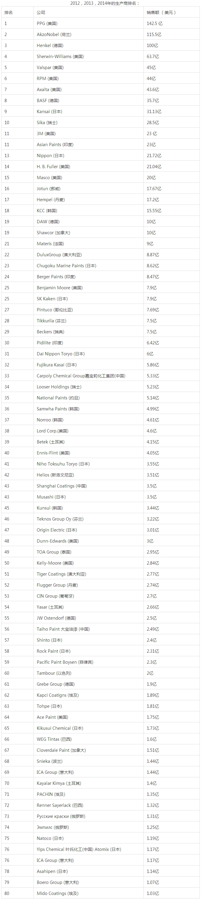 2012-2014全球油漆涂料制造商排行榜