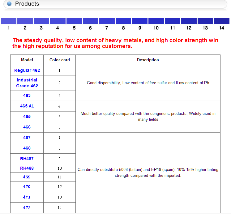 龙口市仁和群青工贸有限公司,位于山东省龙口市,年产量8000吨,主要产品462,RH463,RH464,RH465,R467,RH467,468,RH468,469,470,471,472,已经达到国内最先进的水平,国内其他厂家无法达到我们的品质,468可以直接替代5008, 价格最低,462仅仅6元每公斤。量大有优惠!!!厂家直销,售后及时!